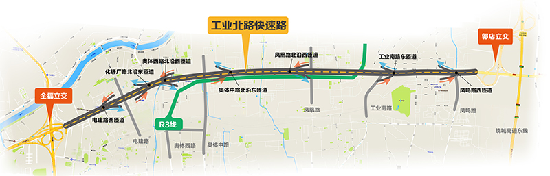 工業(yè)北路快速路西起全福立交橋,東至郭店立交,長(zhǎng)13.6公里,標(biāo)準(zhǔn)段寬25.5米,雙向6車道。沿線共設(shè)置8對(duì)匝道,其中7對(duì)實(shí)現(xiàn)高架橋梁與地面道路的連接,在郭店立交設(shè)置一對(duì)專用匝道實(shí)現(xiàn)高快轉(zhuǎn)換。